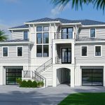 The upper level is designed as a flexible retreat, featuring multiple suites, a gathering space, and a private office, all connected by an elevator and stairs for easy access. Outdoor living continues with an upper porch and balcony, extending usable space beyond the interior. The ground level completes the design with garages, storage, and a breezeway to capture views, providing a practical foundation that supports both functionality and long-term comfort.