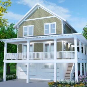 Fort Caswell is a classic beach cottage featuring an open living plan with a guest suite on the main floor. The remaining bedrooms and a home office space is on the upper floor.