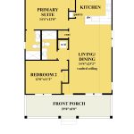 Hanover Street offers an open, airy layout that balances shared living spaces with private retreats. The expansive living and dining area features vaulted ceilings that enhance natural light and create a sense of spaciousness, flowing seamlessly into a well-equipped kitchen with pantry storage. A private primary suite is positioned for comfort and separation, while a second bedroom provides flexibility for guests or a home office. Two full bathrooms, a dedicated laundry area, and multiple storage closets add everyday convenience. A generous covered front porch spans the width of the home, extending the living space outdoors and adding classic charm to this versatile design.