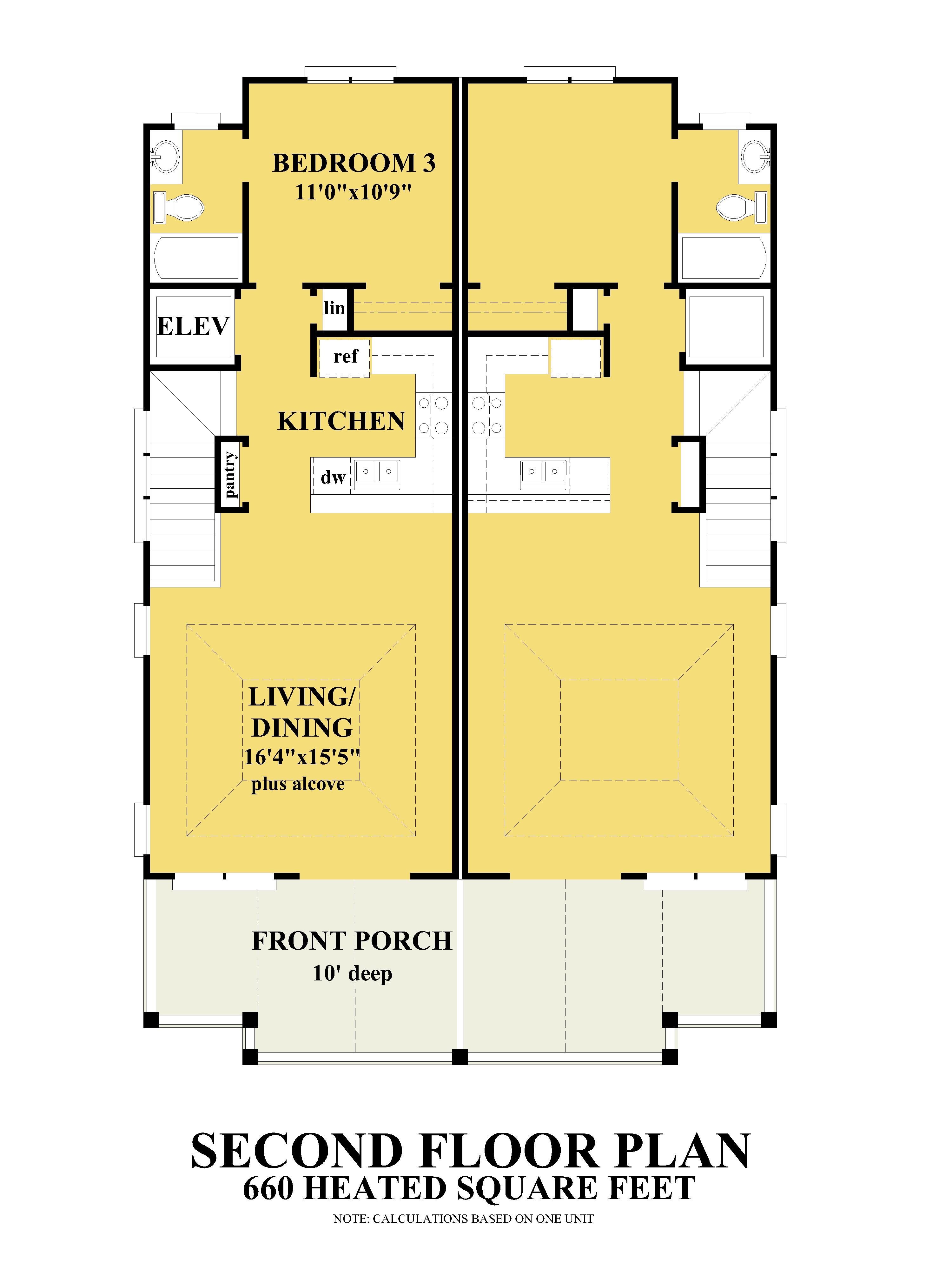Our Searay cottage is a duplex featuring a reverse floor plan, elevator, open living plan and large front porch.